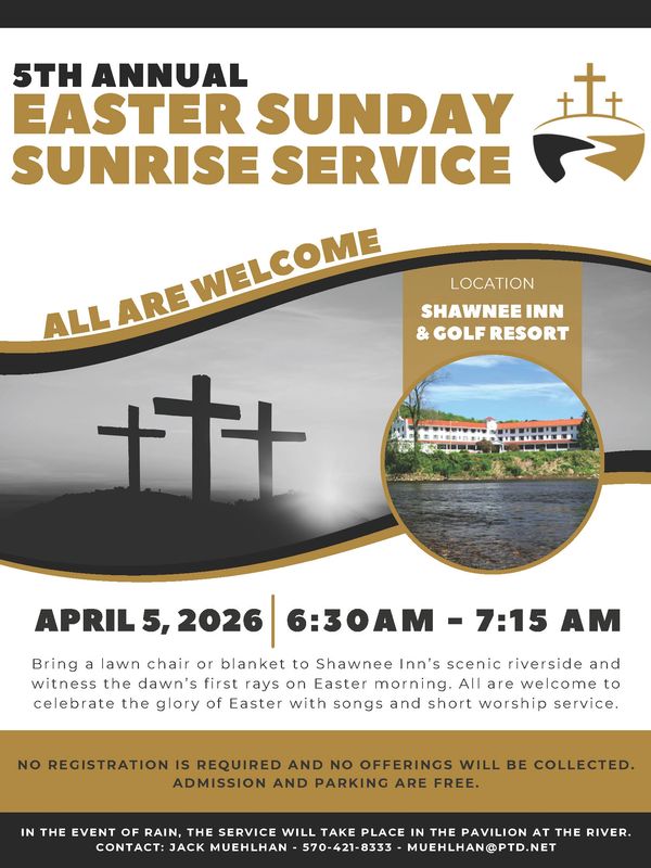 Come celebrate the glory of Easter with songs and a short worship service as a spectacular sunrise ascends over the riverbank of the Delaware River at the historic Shawnee Inn & Golf Resort.